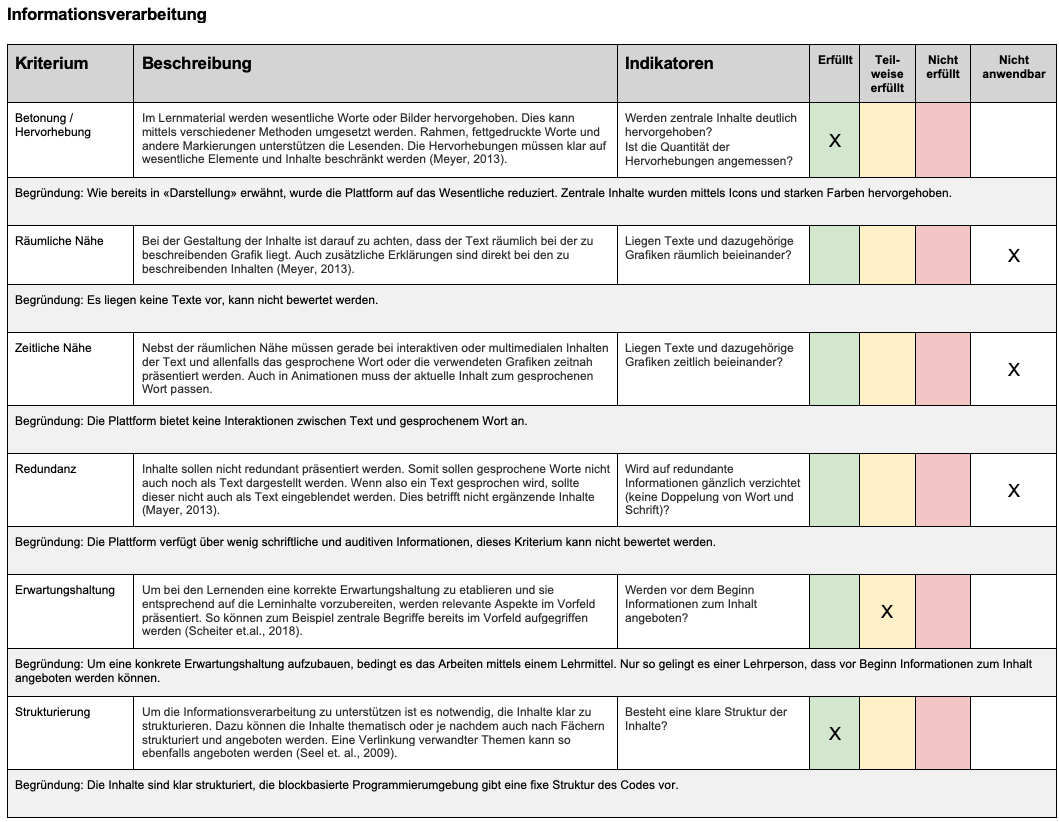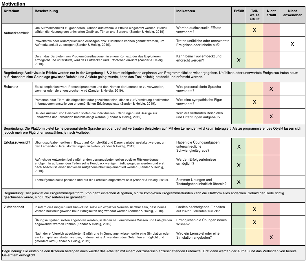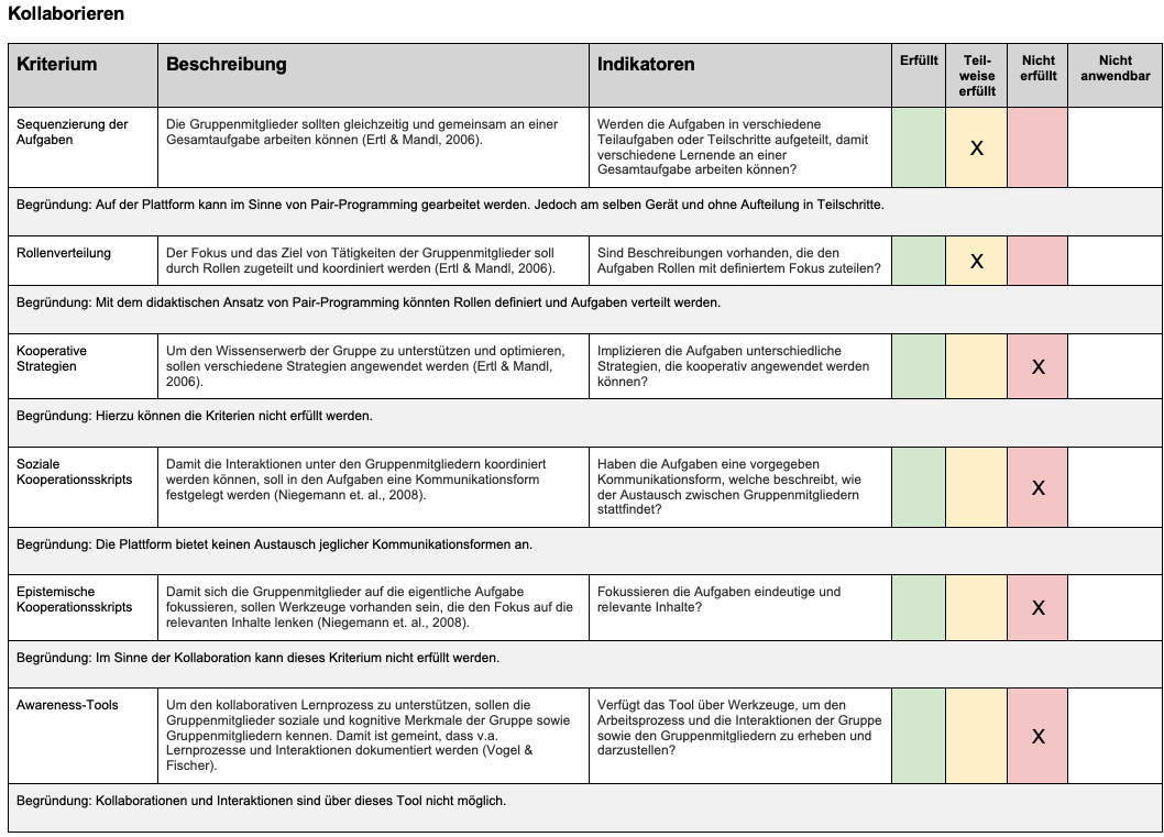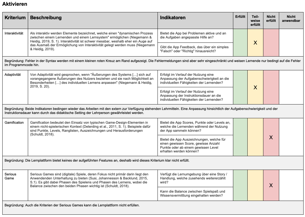 - Kategorie nach McQuiggan et al. (2015): Tool, da die Plattform für die Bildung designt wurde und für das Lernen ein gutes Grundgerüst zur Verfügung stellt. Die Inhalte (geschriebener Code) müssen von den Lernenden anhand von Aufgaben erschaffen werden.