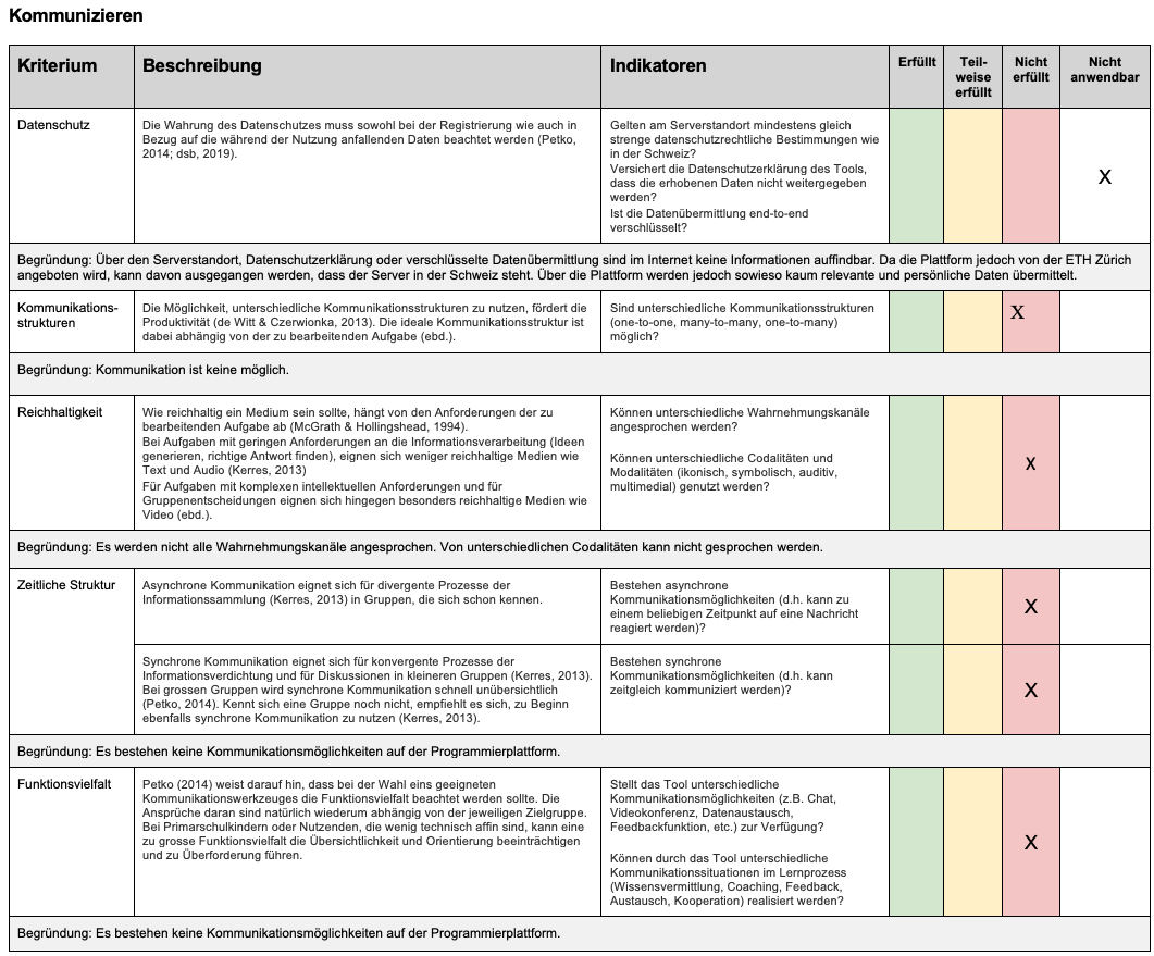 bietet mehrere Möglichkeiten, eine Programmiersprache kennenzulernen. Mit zwei verschiedenen Ansätzen für drei verschiedene Klassenstufen wird versucht, den Schülerinnen und Schülern das Erlernen einer Programmiersprache schmackhaft zu machen. Vom blockbasierten Herumführen der Schildkröte bis zum komplexeren, textbasierten Programm mit Parametern, Variablen und Schleifen wird alles abgedeckt. Die Entwicklungsumgebung ist übersichtlich gestaltet. Nach dem Einstieg stellen sich erste Erfolgserlebnisse schnell ein, was zur Erhöhung der Motivation führen kann. Auf unnötige Dekorationen wird komplett verzichtet. Die Darstellung ist übersichtlich, was optimale Bedingungen für die Informationsverarbeitung darstellt. Aus eigener Erfahrung empfiehlt es sich, mit sogenannten “Challenges” aus dem Internet oder aus den Lehrmitteln zu arbeiten. Diese fördern die Motivation erheblich und erhöhen das Wettbewerbsklima in der Lektion. Wie bereits bei der Bewertung des Tools im Kriterienraster sichtbar wurde, beinhaltet die Plattform auch einige Schwachstellen. Das schrittweise Erlernen der Befehle bindet Didaktikerinnen und Didaktiker an (teilweise kommerzielle) Lehrmittel. Zudem sind die Möglichkeiten der Hilfestellungen begrenzt und ein kleiner Fehler im Code kann dazu führen, dass das Programm nicht mehr funktioniert. Das kann neue Benutzerinnen und Benutzer schnell verunsichern und allenfalls demotivieren. Die Programmierumgebung an sich bietet keine Möglichkeiten zur gemeinsamen Kommunikation über eine Chatfunktion an. Assessments sind möglich, wobei es kommt auf die gewählte didaktische Form ankommt. Während der Zeit des Fernunterrichts im Frühjahr 2020 waren die Weekly-Challenges (auch eine mögliche Form des Assesments), der ETHZ in Zusammenarbeit mit der PHGR und PHLU weit verbreitet und bei Schülerinnen und Schülern sehr beliebt.